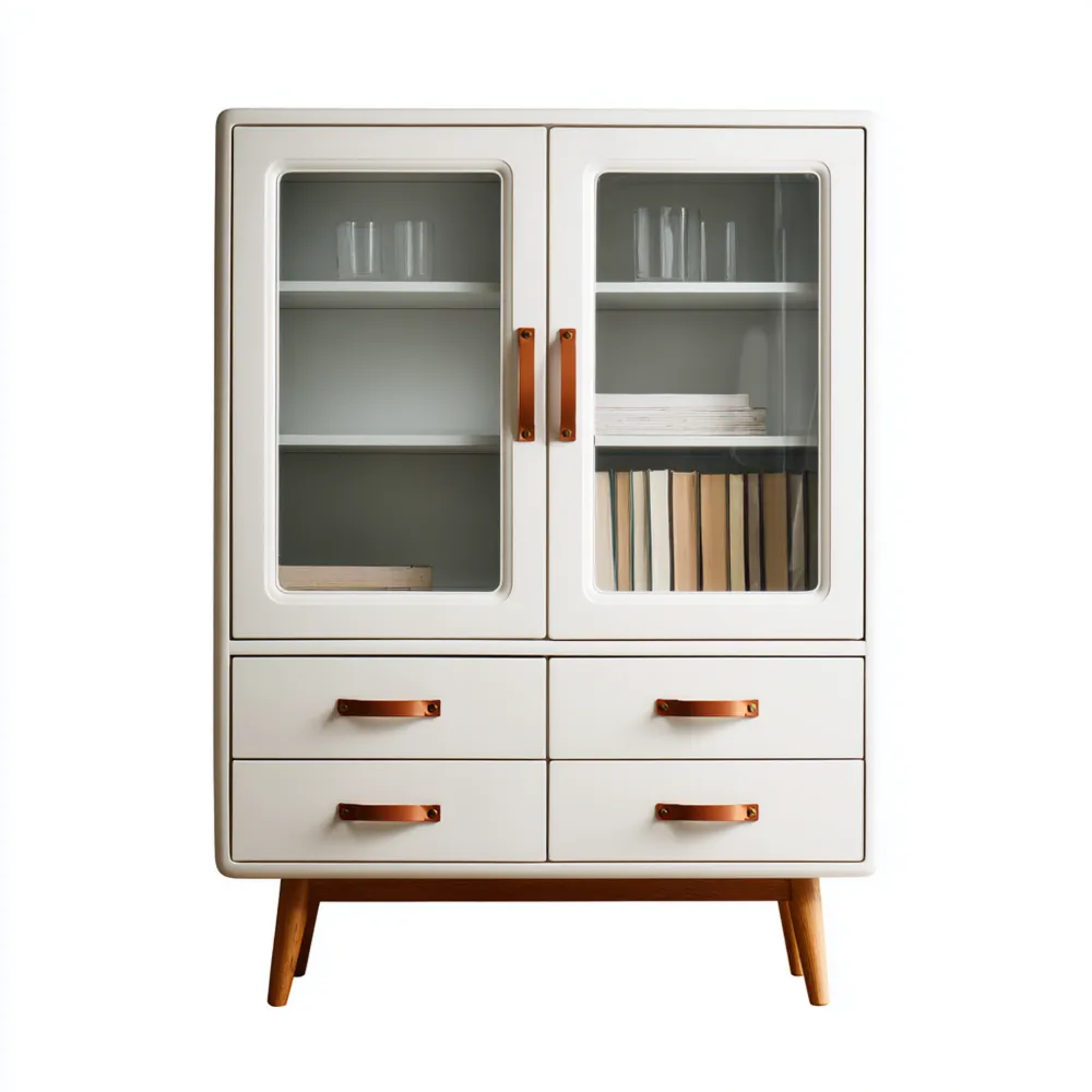 Il mobile è dotato di due ante in vetro e quattro cassetti, offrendo ampio spazio per l'organizzazione e l'esposizione. Il design versatile lo rende adatto per soggiorni, uffici o cucine.